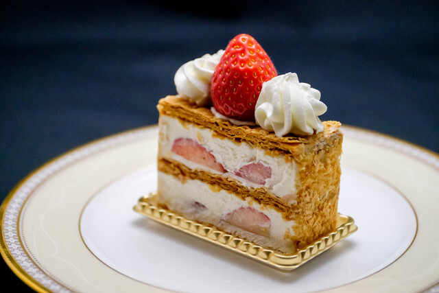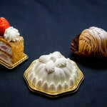 Family purchased. When it comes to Tokyo Kaikan, Maron Chantilly is famous, and I think it is even served at the high-end restaurant in Mitsukoshi Nihonbashi store. I actually tried Maron Chantilly last year. Let's be honest. It didn't suit my taste at all. What didn't suit me was the cream. It didn't match at all, to the point where I didn't even leave a review or take a photo. The same person who purchased it last time also bought it this time, and I couldn't help but feel irritated, thinking, "Don't they remember last year?" I saw it at Marusho Akabane store when I went to eat katsudon, passed by at Mitsukoshi Nihonbashi, and ignored it at other places. So, what came to our house this time was: Savarin (for adults), Strawberry Shortcake with Amaou strawberries, Chocolate and Berry cakes. I didn't buy them myself, so I don't know the prices. Savarin is a type with liqueur in a dropper, which is common nowadays. It is covered with cream and looks pure white like snow. The store said it contains 40% liqueur, making it strictly for adults, but the amount is not significant, so it doesn't give a strong impression (individual differences may apply). Inside, there is cube-shaped pear compote. There is plenty of whipped cream... really plenty. What doesn't match? Probably the extremely high milk fat content. After eating, there is a lingering greasiness in the mouth, which is not very pleasant. I avoid custards that say "made with plenty of whipped cream!" because of this. The same goes for Fukukohi's pudding. Some people may exclaim, "Wow, it's rich and creamy♡," but personally, this type of whipped cream is the worst for me. Well, it's a matter of preference, so it's suitable for those who like thick and heavy creamy textures. Amaou Strawberry Shortcake is almost twice the price of Savarin. Because it uses Amaou strawberries. The acidity of Amaou strawberries is quite strong. The sliced strawberries sandwiched between the sponge cake are likely not fresh but cooked. The texture is soft, and the cream has a slight color transfer from the strawberries. The sponge part melts nicely in the mouth, and it appears to be moistened with a strawberry syrup-like substance, possibly due to the color transfer from the strawberries. The cream is the same. It really makes a strong statement. Chocolate and Berry cake, according to the person who ate it, the berries balance out the sweetness of the chocolate, making it quite delicious. It's all a matter of preference, so it's up to you, but for those who like it, the heavy cream in this cake is quite unusual for modern times. It might be worth trying Maron Chantilly since it's famous. The main restaurant reportedly received one Michelin star this year. I wonder if the food is good. But if they serve this cream in desserts, I'm not so sure.