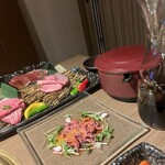 My wife treated me to a yakiniku lunch, but it was hard to find a good restaurant in southern Osaka that serves lunch. After driving around, we finally found this place. We all ordered the "Satsuma Wagyu Assorted Lunch" - a plate beautifully arranged with tongue, Harami (skirt steak), black wagyu beef, pork belly, chicken, sausage, and sweet potato. It came with kimchi, seaweed soup, and rice for 1,280 yen. The set was perfect. Now, it all comes down to whether the meat is delicious or not to judge the cost performance. The tongue was thinly sliced, so I lightly seared it with lemon juice. Oh, it's delicious. It was thin yet had a good texture and chewiness. The pork belly was fatty, so I lightly grilled it with rock salt. Mmm, tasty. The wagyu beef was a bit tough. Each piece of meat was only two slices, so I tried adjusting the cooking time, but even when cooked thoroughly, it still had a resistant chewiness that made it hard to bite through. Not the best. The Harami was... well, it was Harami (laughs). The moderate chewiness and the flavor that oozes out as you chew made it quite delicious. I paid an extra 150 yen to switch the rice for a mini bibimbap. Eating little by little while grilling was enjoyable, and I started feeling full, so the mini portion was satisfying. The restaurant faces a busy intersection on a large two-lane road, making it a bit challenging to park, but the interior has a luxurious feel, and each table is in its own private space, allowing for a calm dining experience. With this quality, the cost performance is satisfactory! Having a leisurely yakiniku lunch when you have plenty of time is truly a luxurious experience!