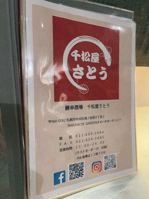 When I opened the door, I was handed a hot towel in 2 minutes. When I opened the door, I was handed a hot towel in 2 minutes. I didn't write it twice for any particular reason. Leaving that aside, when it comes to the store name... On Google local guide, it's listed as "Senmatsuya Kanesen Sato." On Retty, it's "Unagi Kushikushi Sakaba Senmatsuya Sato." On the restaurant's Facebook page, it's "Kanesen Sato." And on Facebook, it's "Senmatsuya Sato." What is the official name then? Well, it seems like a common maze to find the official name of a restaurant, but I won't delve too deep into it. It's written as "Sato" in hiragana. They bring each skewer one by one, which is nice. They offer a variety of eel skewers. Liver with sauce has a slightly bitter taste for a more mature flavor. The liver with sauce also has a bit of bitterness, but it's a good flavor. The eel fillet with sauce has a plump and delicious taste. The collar grilled with salt and wasabi is delicious. The grilled eel is crispy and nicely cooked. I really like the eel collar. Occasionally, there are hints of rice or mochi-like nuances from Sato, but there's no direct connection, yet the phrase keeps coming to mind, and the association just won't stop. Going back to the main topic, I tried other parts too, and each one was delicious. The flavor of the eel and the crispy aroma go well together, especially when paired with sake. It really hits the spot. The deliciousness lingers in your chest. This time, I had a private drink with a fellow reviewer, and the place was crowded as usual. The smoke from the grill affects the flavor of the eel a bit, which is a shame. I also tried a few more dishes as sake accompaniments, such as deep-fried whale and wagyu with ponzu sauce. They were all delicious and perfect for sake. The sake selection may run out occasionally, as shown in the picture, but I enjoyed the eel and other dishes with sake. I would definitely come back to Senmatsuya Sato to try different parts of the eel and enjoy sake. This area, including Tanuhachi Garden, has become a place I can easily visit without getting lost. Kiki - this combination seems familiar. Store Information: Senmatsuya Sato 2F, Tanuhachi Garden, 2-8-2 Minami 2-jo Nishi, Chuo-ku, Sapporo, Hokkaido.