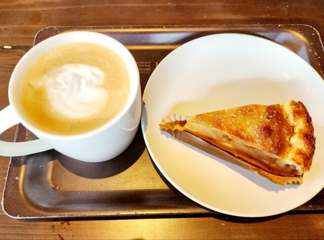 The Starbucks store in Ninen-zaka is housed in a renovated traditional Japanese house, giving it a modern Japanese atmosphere. The first floor is where you place your order and pick up your items, while the second floor is for seating. The second floor has a mix of traditional tatami seating and regular tables. It can get crowded, so finding a seat depends on timing. However, the view of the sloping street from the second floor windows is nice. The café latte comes with the usual art pattern, but the heart shape was a bit blurry. Maybe they don't have much affection for old men (laughs). The apple pie, tagged as a new item, is made with Aomori's red apple and is very delicious. It's not too sweet, has a hint of cinnamon, and the apple has a crisp texture. The combination of café latte and apple pie was delightful, allowing me to enjoy their delicious flavors.