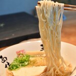 This restaurant, which opened as a three-part reservation store on April 1st, was visited by making a reservation over the phone in late March. The first floor of the store is a famous kombu (kelp) shop called "Gotsuji no Kombu," and the second floor houses a ramen restaurant called "Kombu to Men Kiichi." Upon going upstairs, there is a large single-board table with three wine glasses placed on it. We were given a presentation about kombu, detailing the characteristics of three types of kombu, and then we were able to taste each type of kombu dashi. The Rishiri kombu we first tasted was refreshing with a hint of sweetness, followed by the Makonbu which had a rich umami flavor, and the Rausu kombu which had a strong aroma and a rich taste. Next, we tried the Makonbu's Oboro kombu, where the difference between Oboro and Tororo kombu lies in the method of shaving – machine-shaved versus hand-shaved. It had a mild vinegar acidity, a crunchy texture, and a strong kombu aroma and umami. The "Kombu Ramen" we had this time (1,152 yen) was served in a bowl with chicken chashu, green onions, bamboo shoots, fried tofu, yuzu peel, and Oboro kombu on top, with additional Oboro kombu on a separate plate for flavor variation. The soup, which was mainly made with kombu, was light yet rich in depth, bringing out the umami of squid, mackerel, bonito, shellfish, nuts, tea leaves, and more, without using soy sauce or oil. The noodles were curly noodles with whole wheat flour from the famous ramen shop in Kyoto, "Raamen Touhichi," providing a smooth and slippery texture that complemented the soup well. The moist chicken chashu had a light and delicious taste, and the crunchy green onions paired nicely with the soup. The Oboro kombu soaked up the soup's richness, enhancing the intense kombu flavor, and could be enjoyed alone or mixed with the noodles. The rice served on a separate plate with salted kombu was also delicious, so we bought some salted kombu to take home. Visiting this restaurant made us appreciate the charm of kombu once again. Starting in May, regular business with reservation slots will begin, so it is recommended to make a reservation if you want to ensure you can try their food.