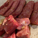 知り合いが美味しいと言っていたので、嫁と二人で訪問‼️駅からは遠いいし、路地裏にあるのでわかりずらいし、飲食店としては不利な立地。そんな中でも常連さんは着いている模様。お肉は美味しいと思います。だけど、ちょっと高いかな…。1番気になったのが、ちょっと高級な雰囲気、お洒落な雰囲気で営業しているのに、カウンターの席を乱雑な感じで潰してしまっているのが、すごく気になりました。カウンターを使用しないならしないでいいから、もっと綺麗にしていてほしい。それが無かったらもっと評価高いのに。まずそれが目に入ってしまい、雰囲気が台無しになってしまったので、お肉の味にも影響したのかも。ご馳走様でした。
