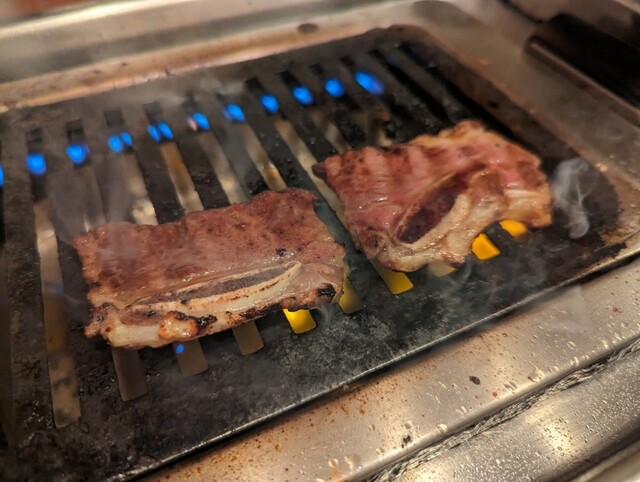 平日の夜に訪問。場所はJR町田駅から徒歩で5分ほど、仲見世商店街の一本奥の狭い路地にあります。外見は見るからに大衆ホルモン焼肉屋の体です。ちょっと女性一人とかでは入りにくいかもしれません。私たちが訪れたのは19時半頃。お客さんは4組くらいいました。ここの焼肉屋さんは、炭火でなくガスです。全体的にお値段はリーズナブルなセッティングになっています。例えばカルビでいえば、以下のようになっています。極上カルビ 1,350円上カルビ 800円骨付カルビ 800円カルビ 650円私たちは、上カルビ、極上タン、上ミノ、鶏皮、豚トロ、ホルモン、キムチなどを注文。ちなみにこの日は牛ハラミの用意がなく、豚になるとのことだったので見送りました。まず最初に出てきた極上タンはかなりの厚手で、サイズもありました。焼いて食べてみると、ちょっとなかなか噛み切れない。。厚みはいいのですが、もう少し柔らかさがあるとさらにいいですね。上カルビは比較的普通。ミノはほとんど印象に残りませんでした。他方、美味しかったのは豚トロ。ほどよく脂がのっていて、甘みがあり柔らかく美味でした。アルコールは1杯のみ。これで2人で合計5,000円ちょっとだったので、安いですね。場末感が漂う雰囲気もなかなかです。