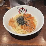 平日晚上9點過後光臨。沒有排隊就進去了。只有吧台座位,購買了食券。油麵標準份量850日元(叉燒是切碎的,需要單點)。桌上有醋和辣油,因為有著明確的調配比例,所以按照那個配方加進去吃了。口味簡單但令人上癮。一下子就吃完了,甚至覺得大份量也可以。很好吃。