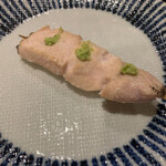 與舊友在老字號的新橋燒鳥店度過了寶貴的時光。店內寬敞舒適,環境安靜優雅。雖然只提前十分鐘預約,但店家還是為我們安排了座位,除了吧台位置外,其他桌子和座敷都已被預訂一空。我們選擇了店外招牌上的燒鳥套餐(7260日圓,含稅)。飲料價格未列於菜單上,讓人有些擔心,但後來得知,清酒吉乃川(一合1210日圓,含稅)和無酒精飲料(一瓶726日圓,含稅)。大根沙拉作為開胃菜,調味方式有鹽和醬油兩種,每道菜品都是一串串地上菜。①鳥胸肉(加了芥末)②雞肝(問了是雞肝嗎?店家回答:「是的,是雞肝!」調味醬)③砂肝(鹽)④鵪鶉蛋(醬油)⑤蔥肉卷(薄的雞腿肉捲蔥、獅子頭辣椒和香菇,沾醬)湯和黃瓜作為小休息⑥肉丸(不是雞肉丸,是真的丸子,鹽)⑦雞皮(鹽)⑧雞腿肉(俗稱蔥鳥肉,有辣椒和醬油)⑨雞心(鹽)⑩雞翅膀(帶骨,沾醬)總計十串,每一串都非常美味。雖然味道沒有太大的變化,但都是新鮮美味的燒鳥,以最佳的烤製程度呈現。我們度過了奢華的時光。每串燒鳥約700日圓計算,每月去一次有些負擔,但一年兩次的話,或許可以享受到這樣至高無上的時刻。因為之後還有另一家店要去,所以我們婉拒了最後的茶泡飯。以上。