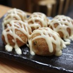 松乃井食堂的美味佳餚搭配葡萄酒後,我們前往天六區享用最後的章魚燒 (*´∀`)♪ 這是同事推薦的店家。我們大約在晚上7:30抵達店家。這家店位於天神橋筋六丁目站步行約5分鐘的地方,沿著都島通而來。乍看之下,它看起來像是一家外帶的章魚燒店,但裡面有用餐區。首先在店門口點了章魚燒。總共有8種章魚燒可供選擇:・岩鹽美乃滋・定番醬汁・素烤・蔥柚子・咖哩起司美乃滋・美乃滋七味・特製醬油・蒜醬油我們選擇了可以選擇4種口味的套餐,點了這個。此外,他們也販售罐裝啤酒和瓶裝茶飲,我們選擇了Chu-Hi。店內有一張可容納4人的桌子和大約4個位子的吧台。自助服務的水和熱毛巾。點完餐後,坐在吧台等待時,章魚燒端上桌來了。<章魚燒16顆>1,200日元(含稅)我們選擇了素烤、岩鹽美乃滋、定番醬汁和蔥柚子。首先試吃素烤,裡面的湯汁味道很好 (*´∀`)♪ 甚至不需要任何調味料也很美味。最受歡迎的是岩鹽美乃滋。確實,這真的很美味 (*≧∀≦*) 醬汁和柚子也不錯,但因為湯汁的味道濃郁,所以鹽味的章魚燒更適合。章魚燒的大小適中,如果不是第二站的話,16顆對一個人來說也足夠了。謝謝美食。<飲料>價格已含稅・氷結檸檬(330日元)