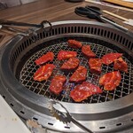 今天是雨天的星期六中午,雖然電車晚點了,但店家靈活應對,客人差不多坐滿了。這家店推薦的是和牛烤肉,比起一卡拉比,這裡的國產牛肉質更穩定。特別推薦他們的厚切牛舌,口感一直很好,不像一卡拉比後半部分肉質下降。另外,這裡的單點菜單裡有厚切牛舌,也有午餐限定的吃到飽。不同的是,這裡吃到飽的套餐沒有無限暢飲軟飲料。我們今天選擇了吃到飽的牛舌套餐。另外,這裡不提供蔥作為調味料。他們有哈拉米牛排、厚切上脊牛排、泡菜拼盤等等,我特別喜歡哈拉米牛排,口感柔軟。另外,他們的國產牛赤肉脂肪少,但很嫩,是我最推薦的。但是,牛腸部位有時會有比較多脂肪的地方,這裡提供的是上卡拉比,脂肪多,不適合生吃,所以不提供生蛋黃。相比之下,我更喜歡通常的肉質比較好的上脊牛排。國產牛肉基本上都是用醬油調味,所以吃不了太多。我喜歡牛舌卷上蒜燒烤,或者配一些味道濃郁的肉一起吃。他們的菜單有期間限定的北海道南瓜和奶油乳酪醬,甜點只限每人一份,但可以反覆品嚐,是難得的甜點體驗。另外還有札幌風味的味噌奶油玉米拉麵,味道超出預期,奶油和叉燒和照片一樣,配上北海道產紅肉甜瓜的拉希冰淇淋一起吃,美味極了。拉希冰淇淋有點甜,蛋糕是甜瓜蛋糕,用了北海道生奶油,非常好吃。中間是蛋糕體,下面是布丁。因為牛舌的肉質很穩定,所以我更推薦這家店。地點在車站附近,下次如果有優惠券的話,我還會再來光顧。