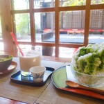 在烈日下最高氣溫達攝氏35度的堀江公園附近漫步時,我意外地發現了這家咖啡館。雖然我多次經過這裡,但這次卻是第一次看到它。這家咖啡館只在週三到週六的白天營業。我鼓起勇氣打開門,進入了一個涼爽且帶著淡淡檀香的和室。仿佛回到了暑假時去奶奶家玩的感覺(笑)。看了菜單後,我決定了要點的餐點,然後去櫃檯結帳,先付款。這一天是7月25日,是剉冰節,所以我點了宇治金時的剉冰(850日元),加上一杯熱咖啡。剉冰是以冰糖漿和配料的形式供應,白玉、栗子和乾紅豆是分開提供的,可以自己慢慢加上去吃。這樣可以避免剉冰在後期融化變水。冰是碎的,但還保留著一絲絲的冰粒感。抹茶糖漿的味道也很不錯,微苦微甜。最讓人著迷的是乾紅豆!宇治金時通常都是以細磨紅豆的形式出現,所以這種帶有咬勁的新口感真的很特別。這是一個非常舒適的空間,讓我不由自主地想待上一會兒。我也想再來試試他們的冰淇淋杯。【附註】之後我又再次造訪了兩次!第二次點了抹茶冰淇淋杯(750日元)。它是從杯子中溢出來的那種風格。白玉和栗子比看起來還要多,感覺很划算。坐在窗邊的位子上,一邊欣賞外面的景色,一邊品嚐冰淇淋,氣氛更是棒極了♡♡第三次點了烤茶布丁冰淇淋杯(750日元)。也許是因為這杯冰淇淋的精緻程度比較高,所以等待的時間稍微長了一些。裡面有烤茶戚風蛋糕、烤茶生巧克力,還有底部的烤茶布丁!對於喜歡烤茶的人來說,這是一個不容錯過的冰淇淋杯。夏天的營業時間是到下午5點,但天黑之後好像會提前到下午4點結束?再次找到合適的時間去可能有點難|ω・`)但我一定會再去的!