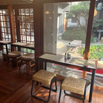 初次光臨山茶花餐廳前,偶然遇到了一處打開的時髦建築門戶(看起來約2x5公尺大,相當沉重)。靠近一看,原來是萬福寺(浄土真宗),裡面有一家咖啡廳。距離午餐地約30公尺,營業時間1300點至晚上。我們決定在午餐後來這裡吃點心。我們在1300點過後進入,前面已經有一位客人了。儘管外觀時尚,但內部卻有一種獨特的氛圍。寬敞的座位安排和充滿木質溫暖感的環境。菜單上有①甜點(抹茶提拉米蘇、乳酪蛋糕、茶香戚風蛋糕)和②茶品(煎茶、抹茶、拿鐵、咖啡)組合的價格範圍是900到1100日圓。如果選擇在①甜點中再加7種茶點,則價格為1250到1350日圓。我們點了一份1000日圓的套餐,包括了①抹茶提拉米蘇和②宇治煎茶。結帳是在收銀台,先付款後上菜。上菜時間為②茶品7-8分鐘,①甜點12-13分鐘。在等待①上菜時,有指示可以先享受茶品。煎茶的溫度約80攝氏度,倒入茶杯中約70攝氏度,風味極佳。後來還可以補充熱水。①甜點的生奶油相當豐盛,但在抹茶的調和下保持了平衡。吃了大約一半時,決定嘗試一下剩下的紅豆,這樣不僅能改變口味,還增添了口感上的變化,非常推薦。我們在1325點離開,餘下4組9位客人。這是一家讓人想多留一會兒的咖啡廳。由於營業時間較短(週三至週五1300-1600,週六1100-1700),請注意。