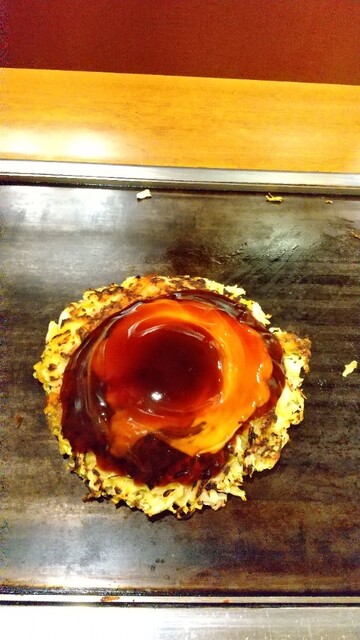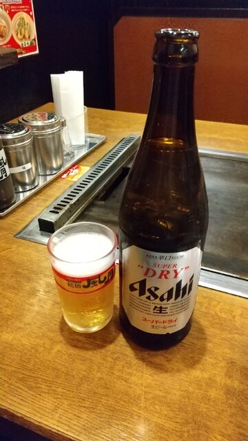 夜晚,獨自一人造訪這家餐廳。我被帶到了一個四人用的包廂座位。每個包廂都配有鐵板。我點了"豚たまモダン焼き"(1,110日圓)和"蔥拌"(額外220日圓)。順便說一句,關於蔥,可以選擇混入麵糊中的"蔥拌"或者作為配料的"蔥撒"。服務員將食材送到座位上,然後在客人面前的鐵板上進行烹飪。碗裡有麵糊、炸玉子、雞蛋、白菜、豬肉、紅薑和一些蔥。我加入了額外的蔥拌。混合在一起。豬肉似乎也是生的混入其中的。在鐵板上塗上油脂。將混合好的碗中內容物倒在鐵板上,整形成圓盤狀,然後放置加熱。運來了已煮熟的中華麵條。非常粗。它被宣稱是"熟蛋麵"。將其放在煎餅上。然後在上面詢問客人是否需要,並撒上鰹魚片。翻轉並繼續烹煮對面。這個步驟需要一段時間。再次翻轉回正位。在上面抹上美乃滋,塗上醬汁。這些量都稍微減少了。這樣就完成了。整個烹飪過程大約花了20分鐘。座位上還準備了醬汁、青蔥和辣椒粉。主體部分像熱鬆餅一樣鬆軟且帶有甜香。加熱過的蔥和白菜的美味也可以品嚐到。豬肉的風味也很好。麵條似乎沒有煮熟,但又烤得太過。這讓口感變得不太好。這一點非常明顯,與主體不協調。過去,在幾家其他大阪風格的餐廳中,我都吃過使用粗麵條製作的豚玉麵,都很好吃,所以在這裡有些失望。"瓶啤酒(中)"(600日圓)是Asahi Super Dry。總共1,930日圓,使用WAON支付。