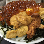 我們先在店門口被誘人的香氣所吸引停了下來。這裡有新鮮的北海道海鮮,像是帶子和魷魚。然後我們進到店裡。店裡擺滿了北海道的代表性海鮮,像是帝王蟹、雪蟹、毛蟹,還有帶子和鮭魚等等。店裡還有用餐區。我們就在這裡用餐。我點了海膽魚子飯,她點了毛蟹飯。兩份都份量十足。海膽飯有濃郁的甜味和海草的香氣,非常美味。魚子是店家自製的,味道絕佳。毛蟹飯也是滿滿的毛蟹!真的是奢華至極。可以充分享受到毛蟹的甜味。飯量相當多,所以也有半份的選擇。對於女性來說,半份絕對夠了。下次來小樽一定還會再來這家店。