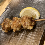 三人一起去的,所以不是坐在吧台,而是坐在桌子旁邊。有兩張四人桌子排在一起,感覺像是半私人的座位。桌子之間有薄薄的百葉窗。串燒是點了之後才會上菜,每次會上三串。這裡的串燒果然好吃。我很喜歡這裡的雞肉丸子。在鳥よし出身的店裡,這家可能是我最喜歡的。