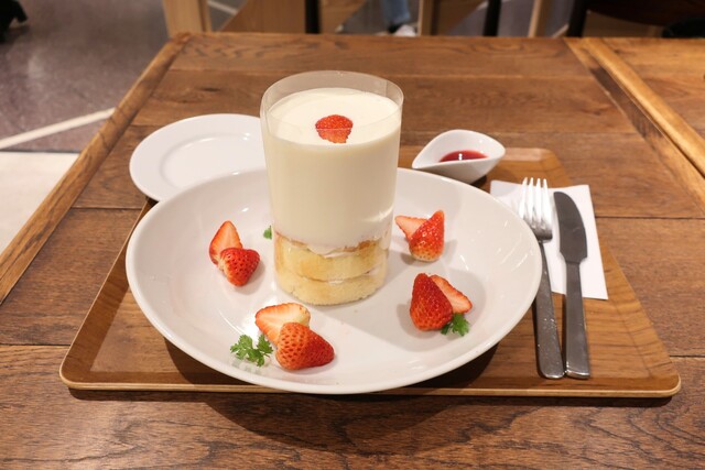 2023年4月22日,京都塔重新裝潢後,增設了新的店鋪。一樓北側現在有伊藤軒的店鋪,土產區可至晚上9點購買,但喝茶的客人最晚點餐時間為晚上8點。喝茶的客人先佔座位,然後到櫃檯點餐。結帳後,拿到號碼牌,放在桌子明顯的地方。水是自助服務,放在櫃檯後面。 ✨✨✨✨✨✨✨✨✨✨✨✨✨✨✨ 為了慶祝開業,從現在到5月7日,展示京都塔官方Instagram https://instagram.com/kyototower_itoken 或石川縣的Cafeたもん https://instagram.com/cafetamon 的貼文,點春季特別合作點心『春天的雪融化班戟』,就可以免費獲得一杯飲料,對於想吃班戟的人來說是一個推薦的優惠。 ✨✨✨✨✨✨✨✨✨✨✨✨✨✨✨ ■點餐菜單(與位於金澤的Cafeたもん合作) 春天的雪融化班戟 1900日圓 我參加了Instagram的活動,點了一杯熱茉莉花茶...茶壺裝的,可以喝幾杯。 ◆評論 Cafeたもん使用的米粉製作的班戟裡充滿了大量的奶油,拿起外面的薄膜,奶油就會滑落下來,真是令人心動。真是讓人感受到春天的來臨。不僅讓人視覺上愉悅,而且吃起來味道也很美味。還有草莓醬,中途可以變換口味,一直吃到最後都很好吃。奶油很多,如果有湯匙就更好了,所以我用附帶的湯匙舀奶油喝。還想嚐試其他點心。