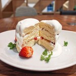 京都塔觀景台因外國遊客和學生團而擁擠不堪,無法行走,所以我迅速地一圈後來到這家店。這家店是上個月開張的。櫥窗裡擺滿了草莓,我以為這裡是草莓專賣店所以就來了。水是自助式的。我點了「草莓田」,售價1,408日圓。草莓很水嫩,但不甜,味道平淡。只是和鮮奶油搭配得很好。裡面的鐘形蛋糕很甜。不知道為什麼要放進來?外觀很可愛但味道普通。