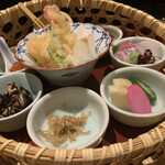 星期六中午去了這家店。我剛好在開店時間到達,但是前面已經有很多人在排隊了。有一張寫著名字和人數的紙放在那裡。我填寫好名字後放在那裡,大約在12:10被告知要在店前等待。能夠預約,而且不用在店前等待讓我感到很高興。在這個時候,必須點好要吃的東西。當被引導到座位後,我點的菜很快就上來了,讓我感到很開心。這是一份限量供應的籠盛御膳,價格為2,590日圓。湯→湯底非常香濃美味,裡面有牛蒡。飯→份量偏多。米飯中間有一種堅實的感覺,有點偏硬。我比較喜歡軟一點的米飯……。他們還給了一些鍋巴,撒上芝麻鹽非常好吃。雖然還有湯底可以淋在飯上,但味道有點怪,我不太喜歡。小菜→天婦羅(蝦、茄子、秋葵、白肉魚,熱騰騰又美味)、魚子醬、生魚片(口感Q彈又美味)、若干小魚、煮紫菜、煮海帶芽、生麩、醬燒鰆魚。醬燒鰆魚是最令人食慾大增的。他們也很快就補茶,也關心是否需要補飯,這點讓我很感激。只是,可能因為店裡很擁擠,吃完飯後他們就讓我趕快離開,付了帳之類的,讓我有點壓力。