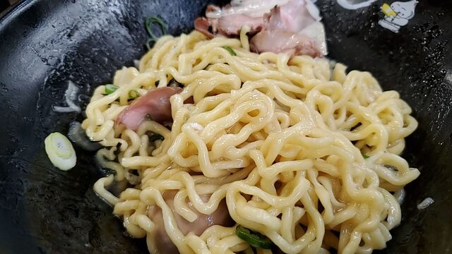 久しぶりにぼっけもんさんへ。狛江にGO!メニューはにんにくラーメン・醤油ラーメン・とんこつラーメン・みそラーメン・ピリ辛スタミナラーメン。そして汁なしにんにくラーメン・油そば黒(しょうゆ)・油そば白(しお)・油そば赤(ピリ辛)。そして丼もの、鉄板です。前回は汁なしにんにくラーメンを食べたので、今回は白い油そばにします。●油そば白(しお)@650+味玉@100(全て税込)をポチっと購入しました。この日は祝日の13時過ぎですが、混んでいました。狛江で人気の様です。14分待ってご対麺です。黒い丼で登場。具はピンク色の薄切りチャーシュー2枚、オニオンスライス・メンマ・青ねぎ・刻み海苔、そしてトッピングの味玉です。小皿で味変用のレモンの櫛切りが出てきます。熱いうちに良くかき混ぜます。麺は中太の縮れ麺、混ぜると麺肌は油を纏い、テカテカ。それなのに、食べると、それほどしつこい感じはなく、どんどん食べ進められます。醤油だよりも塩ダレの方が好みかな。タレは鶏ガラ、カツオ、昆布だしだそう。なるほど旨味がしっかりとあります。チャーシューは肩ロースで低温調理のモノ。柔らかく、味は抑え目で、タレの味で食べられます。メンマは極太ですが、歯を入れるとすっーと繊維が避けます。味は濃い目です。オニオンスライスがシャキシャキ食感で良いアクセント。途中で味変します。にんにくすりおろし、ごま、紅しょうがをオン。にんにくの刺激が加わり箸がススミマス。後半はレモンを絞ってあっさりと。お酢もおいてありますが、レモンの方が好みです。食べ終わるとタレが丼底にはほとんど残っていませんでした。チャーシュー油そばでなくても十分に堪能できました。