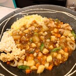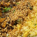 暑かったので刺激を求めて店を探していたところピリ辛とチャーハンの組み合わせ看板が目に入り入店しました。価格1200円真ん中に見えるのはガーリックチップぱらぱらチャーハンとピリ辛あんの3層美味しかったです。御馳走さまでした☺️
