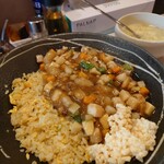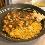 こちらはあんかけチャーハン専門店です。わざわざ店頭には「ラーメンは置いてありません」と標示してあります。メニューは2種類のみの潔さ!■五目あんかけチャーハン■辛みそ肉あんかけチャーハン私はスタンダードな『五目あんかけチャーハン 1,200円』をいただきました。シェフ二人並んで大きな中華鍋を振り始めました。背中しか見えないので調理の内容がわかりません。どちらかがチャーハンでもう片方があんを作っているのでしょうかね?程なくしてあんかけチャーハンの出来上がり。お皿が大きい。チャーハンの上にはあんがたっぷりかかってます。端っこにはおこげが少し添えてあります。あんの具は「えび、小柱、鶏肉、アスパラ、しいたけ他」と書いてありました。「にんじん、たけのこ」の姿も確認できます。チャーハンはそのまま食べてももちろん美味しい。さっぱり味でガンガン食べられます。あんをまぶすと中華丼のような味わいになります。たけのこや人参のシャキシャキした歯ごたえが美味しい。そんなに濃い味ではなくちょうどいい濃さ。野菜スープが優しい味なので、たまにスープをすすると口の中がリセットされ、また美味しいあんかけチャーハンを食べ進められます。結構ボリュームがありました。あんかけチャーハンの専門店だなんて珍しいですね!