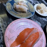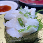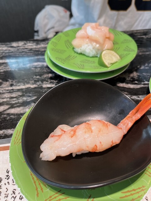 非常美味!作为姜爱好者,特别喜欢多生姜的鱿鱼和鰯鱼。用大块海苔包裹的盐麴腌制的白身鱼也很美味。可能是鰊鱼吧?虽然点了本鮪赤身,但与在带着传送带的餐厅里不太一样,有点遗憾。但是我现在明白为什么要排队来这家旋转寿司店了!
