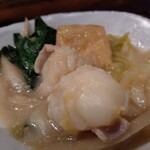 【2018年10月14日】调查报告。与朋友临时决定一起喝酒,所以选择了花街的先斗町(ぽんとちょう)。我选择了以牛杂烧锅而闻名的「牛杂烧锅 寅屋」。我们在17:20到达,当时已满座,只能在外等待。店内环境如下: - 内观:店内氛围舒适,木质吧台很宽敞。 - 座位布局:一楼吧台7个座位,二楼4人桌5张,总共20个座位。 - 运营:吧台里有两名穿白色制服的男性,还有一些人在厨房,虽然看不到。以下是点菜和评价。↓↓↓↓ 首先,"开胃小吃" 以三层盒子一次提供了两份。有烟熏肝脏、豆腐沙拉,还有一道我忘了的菜...(笑) "牙根软骨 咔嚓一味炸" 580日元。有咔嚓咔嚓的口感,因为稍微辛辣,非常适合搭配酒。 "山芋和大根沙拉" 680日元。大根切得很多,嚼劲十足,有芝麻酱油汁,清爽可口。山芋的粘稠也很好吃。 "寅屋的煎蛋" 780日元。鲜美的煎蛋包裹着浓郁的酱汁。 "牛杂烧锅" 1500日元(一份)。由店员使用IH电磁炉从头到尾烹制,非常方便。汤底使用了白味噌,不使用化学调味料,烹制时间超过10小时,味道略带甜味,有很浓的厚重感。肉杂处理得很好,没有异味,非常美味。弹牙的肉杂富含胶原蛋白,女性也会喜欢。配菜包括:卷心菜、韭菜、豆芽、水菜、牛蒡、炸豆腐,调味料有:黑胡椒、七味辣椒、柚子胡椒。可以根据口味撒上喜欢的调味料,然后撒上鱼片粉,享受美味。 "收尾是" 七味乌冬面 " 700日元。在煮过一段时间的牛杂烧锅汤底中稍微煮一下,撒上葱和七味辣椒。山芋的黏性与乌冬面很好地搭配,汤也很美味。 "寅屋自制 榆树饼" 480日元。榆树饼有弹性的口感,单独食用口味略带清淡。黑糖和黄豆粉的组合非常美味。餐后提供了京番茶来收尾。 【总评】美味的牛杂烧锅价格相对合理,非常令人高兴。除了牛杂烧锅以外的菜品也非常美味,非常方便。但是,周末等时常需要排队,可能需要考虑等待时间。