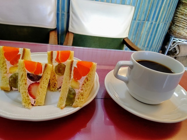 这是我之前访问过的一家餐厅。这次我在早晨时段光临了。○店内情况周六早上10点15分,我到达了店前。尽管刚刚开门,但内部几乎座无虚席。客人年龄较大,大多数是当地居民。这是一家非常受欢迎的店,不断有顾客前来。○菜单除了咖啡和红茶等饮料外,还有出前巻三明治和咖喱猪排等餐点。不能单点食物。在上午10:00至11:30之间,您可以点早餐菜单。您可以点配搭咖啡或茶的热三明治或热煎饼等。○水果三明治套餐(1100日元)-水果三明治共有4片。各个三明治是由三角形吐司夹着各种水果和奶油制成的。水果种类包括草莓、香蕉、橙子、葡萄、苹果、猕猴桃、菠萝等,色彩非常丰富。奶油有两种,一种是鲜奶油,另一种是草莓奶油。这个组合有点不寻常。吐司本身也相当甜。这是一款能让您慢慢品味到蓬松甜奶油和甜酸水果的佳品。-混合咖啡(热)颜色较深。是浓郁的咖啡,感觉相当浓烈。口感轻盈,相对容易饮用。我在这里享受了独特的水果三明治。如果有机会的话,我想邀请朋友再次光临。