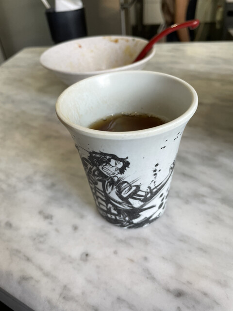 从8月8日开始,我得知这家餐厅在限定时间内提供晚餐服务,我在下班后驾车赶到,到达时间大约是20:40,在有两个停车位的停车场停下车,然后进入店内。今天我还没有吃晚饭,所以购买了“到底的一半”套餐(950日元)的食券,然后被引导到吧台座位。碗里盛有叉烧肉、葱花、竹笋和切碎的葱,汤里撒上了一半的鱼粉和辣椒粉。首先,我猛烈地搅拌麵条,使其和汤汁融合在一起。汤汁是浓郁的鸡白汤,虽然油腻但没有沉重感,鱼粉的香味和微辣的口感给汤汁带来了味道。打磨的粗麵條有嚼劲和黏性,即使与浓郁粘稠的汤汁混合在一起,也能充分体味到麵条的美味。我添加了生蒜片,味道更加浓郁,感觉到增加了体力。叉烧肉盛了两片,无论直接吃还是蘸汁吃都很美味。这家店的服务还包括餐后茶,这次我喝了柠檬茶,最后使口腔清爽后离开了店铺。根据官方Instagram消息,夜间营业仅限夏季期间,但可能会有延长。