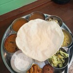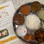 大约下午1点半到达。外面等候的人有4人,之后又来了3人。有3个吧台座位和6张桌子。入店等待大约30分钟。队伍在下午2点15分左右才解散。菜单有素食、非素食、全加配、以及大约两种咖喱选择。在入口处点菜和结账。点菜到食物送上桌大约需要5分钟。我点了非素食,价格是1750日元,可以选择鱼或鸡。食物盛在银色的碗里,包括了7种咖喱、豆类、酸奶,还有一种类似米饭上的烤饼、泡菜和炸物,总共有10种配菜,可以混合食用。桌子上有吃的指南,所以不用担心。对于高级别的顾客,还提供了用手吃的指南,如果用手吃的话,还有小碗供应。所有的配菜都不太辣,但有一种香料的味道。每一道都做得非常精致,味道浓郁。单独品尝也很出色,但混合在一起,根据混合的方式,会不断唤醒新的味觉。没有时间漫不经心地吃。虽然保留了南印度的烹饪方法,但也经过了调整以适应日本口味,因此吸引了许多人的喜爱。
