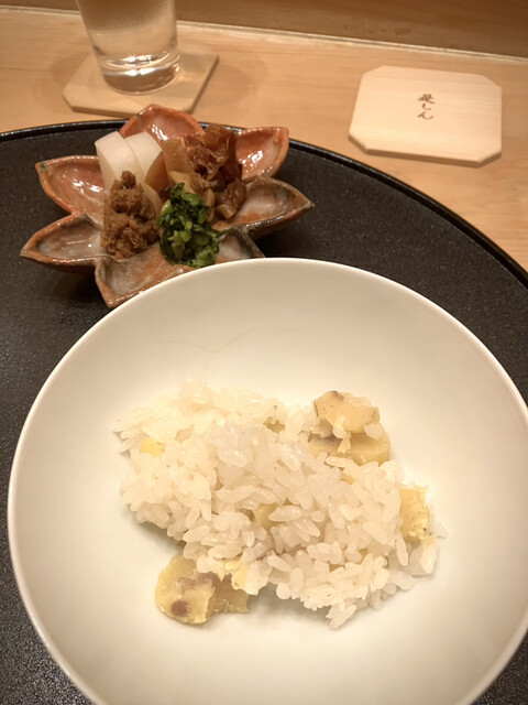 大阪・西天满街已经初冬了。迎来了立冬。“山茶始开”。从茶碗蒸开始。这是一道用蛤蜊汤蒸制的菜品。尽管一开始以为是银杏,但里面实际上是栗子,与蛤蜊汤的搭配非常好,味道十分美味。还有甜虾的白酱油腌制和千层萝卜。香住的甜虾非常大而有嚼劲。腌制在白酱油中使其更加甘甜。碗里是用鳙鱼熬制的汤底,里面有鳙鱼和本蘑菇。鳙鱼的油脂融入了汤底,味道浓郁。新鲜的葱是季节的点睛之笔。还有鲷鱼和鲇鱼的握寿司,以及鲷鱼和鱿鱼的刺身。这天我们选择了日本清酒,确实,和懐石料理非常搭配。所有的鱼、佐料和米饭都是为了搭配日本清酒而准备的。八寸菜。这里也有时令的鳕鱼棒寿司。柿子泡菜也美味到令人感动。秋刀鱼、鱼卵、鳕鱼白子。如果没有太太的指导,我估计光这一道菜就能喝掉三合清酒。还有秋刀鱼的杉木板烧和烤松茸。这种做法非常朴实,但在日本料理中,烟熏的香气经常被用来增加氛围。把食物呈现给客人的时机也是非常重要的一环。我非常喜欢这个。店里飘散的香气也是一个重要的细节。今天的主食是栗子饭。据说这是因为秋天采摘的栗子要保存一个多月,才能在立冬的时候供应,确实,栗子饭既甜美又湿润。从鼻子中散发出的香气非常令人愉悦。这次还加入了柑橘的酸味调味,以及时令葱和薄荷的点缀。还有杉木板烧等等,各道菜的香气呈现得非常出色。这不仅仅满足了味觉,还极大地刺激了其他感官。这天和店主聊天时,提到了竹笋的话题。在这家店,冬天可以品尝到早挖的竹笋,我回家后让女儿尝试了一下,她在学校被问到“冬天想到什么?”时回答“竹笋”的故事。一般来说,竹笋是春季的时令食材,我似乎传递了一个错误的信息给她,但是这家店的冬季竹笋确实非常美味。我下次一定要去品尝一下。所以我决定在下次来访时再次光临。那天晚上是“皆既月食和行星食”的天文表演。在清冽的初冬夜空中,吉兆出现了。就这样吧。