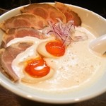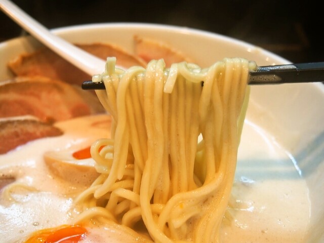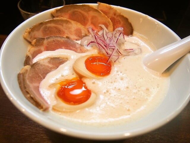 午餐时间人们排队等候,我有时间的时候去了这家不大的店铺。店内只有吧台。一听到店里的口碑,就会有顾客聚集,需要排队等候。现在说说那泡沫浓郁的汤的香气,非常好闻,尝一口是浓汤类的口味,蔬菜的美味融合在一起,味道复杂。再者,可能是黄油的香味,有一种高雅的香脆感。面条是光滑的直面条。非常搭配浓郁的汤。一起点的叉烧饭也很美味。如果有机会的话,我想再来一次。