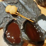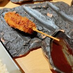 这家餐厅位于JR北新地站附近,食客在食评网站上给予高度评价。我一直很好奇,最近终于有机会去尝试了一次。一开始的开胃菜是新鲜的蔬菜和浓郁的酱汁,令我难以忘怀,从那时起,我就对他们坚持的炸串料理着迷不已,可以确定我会再次光顾。我品尝了以下美食: - 开胃菜:万願寺唐辛子和椎茸芝士豆腐 - 串炸海老 - 串炸鹌鹑蛋 - 岩手县产猪肉 - 稚鮎鱧 - 串炸土豆 - 白松露盐洒在洋葱、鲑鱼和豆腐船 - 帆立贝和鳕鱼与炸茄子 - 宫崎牛肉的涮涮锅串 - 目玉蛋汉堡 - 咖喱 - 甜点(可选):みたらし团子和冰淇淋。
