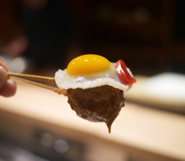 这家餐厅只提供套餐,菜单内容几乎没有固定,会根据时令食材不断更换。但套餐中唯一确定的项目是展现“北新地串炸”的魅力的三种串炸:虾、鹌鹑蛋、牛肉串。【菜单】:虾、鹌鹑蛋、牛肉串、鳗鱼配秋葵酱、奶油土豆白松露盐、白芦笋、烤肉、煎蛋汉堡咖喱、海苔茶泡饭、甜点(另外还有4道菜)。【饮品】:生啤酒、两杯威士忌苏打。