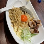平日19时。店内无人。拌面1000日元+大份50日元。面条很大份,相当丰盛。碗的大小也加大了,稍微有点难以吃完。可能选择普通份量更好。口感是有嚼劲的类型,不是用冷水冲洗的。面条大致是中粗的,但逐渐变得更松散,这让吃起来更困难。调料也不容易搅拌均匀。3.0配料的煮干鱼酱浆口感柔和,成了非常细腻的酱浆状。这一点很不错。叉烧肉是边角料吧。皮部分很脆,我不太喜欢,感觉像鱼骨一样。葱也没有切得很细,感觉有点粗糙。黄油的风味有一点点,但并没有突出,只是口中略微能感觉到。我对一些部分有很高期望,所以这次有点失望。这里的煮干鱼汤很推荐。