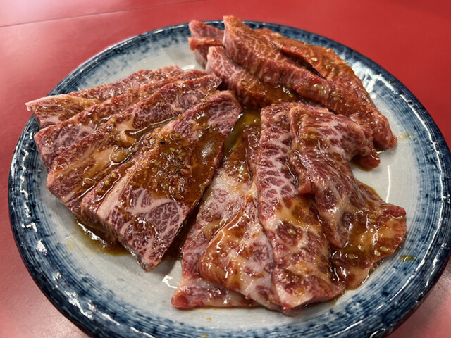 这已经是我第三次来了。当天也可以预订,位置有点偏远,不开车去可能有点不方便。餐厅有吧台和桌子座位。吧台座位给我一种常客的感觉。菜单如下: - 盐烤牛舌 1,650日元 - 带脂肪部位 1,280日元 - 和牛腩肉 3,930日元(西泽先生的神户牛) - 生牛心 950日元 - 牛仔骨 700日元? - 蛋花汤 470日元 其实我本来想尝试特上盐烤牛舌的,但是卖完了,有点遗憾。虽然肉价有点高,但肉质很好,味道也很美味,我很满足。因为有很多稀有部位,所以下次还想尝试其他部位。