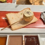 我曾经想知道是否有好吃的串炸物店,所以进行了一些调查,找到了这家店。虽然它也有串炸物,但与传统的大阪灵魂食品串炸物完全不同。当然,串炸物的魅力在于每根串都可以品尝各种不同的食材,但制作它们需要很多工夫。当你告诉他们“是猪肉”或者点菜的名字时,你可以确定一点,那就是你无法想象它的味道。因为每个串炸物都有一些意想不到的东西,可能会有其他配料,或者与意想不到的食材一起炸制,所以永远不会感到厌倦。虽然我不喝酒,但听说这里的葡萄酒种类也很丰富,所以我觉得对喜欢喝酒的人来说,这家店应该是个满足的好地方。