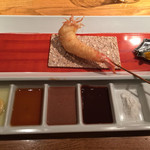 在开始使用食べログ之前,我曾两次访问过这家餐厅,但之后已经有很长一段时间没有来了。这次我们提前预订并前来用餐,被引导到了桌子上。当我到达时,餐厅里座无虚席。首先,他们给我们端来了沙拉和各种酱料。我们先来一杯生啤酒干杯。周围的氛围有点喧闹,不太宁静,与安静地享受葡萄酒的氛围完全不同。串炸是美味的,从虾串开始,最后以芝士串结束。在此期间,大约有20种不同的串炸上桌。每一种都很美味,但我特别喜欢豌豆饼串炸,简直美味到了极致。食物的分量相当大,吃得非常饱。实际上,我本想更慢地享受葡萄酒的,但是...