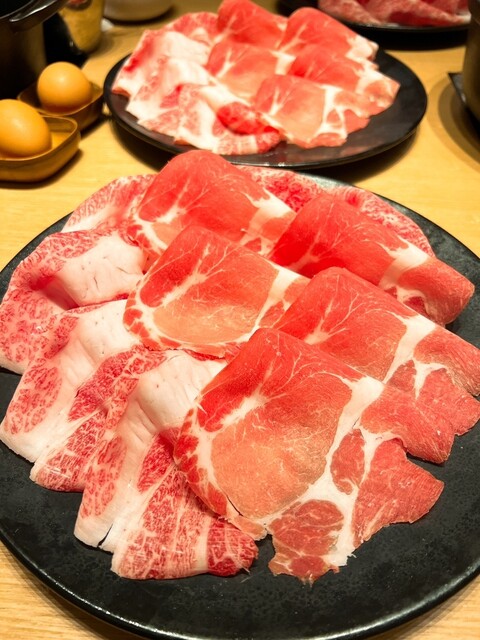 JR大阪站西口直结的KITTE大阪,有一家可以享用A5等级的鹿儿岛黑毛和牛和日本三大和牛、鹿儿岛黑猪的火锅店✨星期五晚上8点左右去的时候,店里客人很多,很热闹,环境干净且舒适。坐在吧台的座位上,可以享受眼前切肉的现场感,每人一锅的形式也让人可以按照自己的节奏享用涮锅或寿喜烧。而在包间里,可以一边欣赏大阪站的夜景,一边悠闲地用餐✨ 〈这次点的菜单〉 Naniwa套餐5720日元 【小碗】可选择的前菜:『松露土豆沙拉』或『黑毛和牛和肉酱的馅饼』或『番茄沙拉』 【蔬菜】精选的蔬菜拼盘 【肉类】神户牛肩肉40g + 黑毛和牛胸肉40g + 鹿儿岛黑猪肩肉60g 【主食】白米饭或拉面或乌冬面 【甜点】可选择的甜品:『北海道牛奶与覆盆子的双色冰淇淋』或『抹茶焦糖布丁』 这套餐可以选择寿喜烧或涮锅,我选择了寿喜烧。小碗选择的是黑毛和牛和肉酱的馅饼,甜点则选了抹茶焦糖布丁。这家店的寿喜烧是用砂糖烧烤的关西风味。先吃了一口煎牛肉,肉质鲜嫩,美味无比。接着和蔬菜一同煮的牛肉和猪肉也非常好吃。品尝了神户牛后,接着是鹿儿岛黑猪,脂肪含量恰到好处,肉的鲜美感十足。切好的肉摆盘精致,小碗的黑毛和牛和肉酱馅饼以及抹茶焦糖布丁也很雅致。 另外,店里有多种酒类选择,如『箕面啤酒』和『河内葡萄酒》,可以与肉类搭配,丰富用餐体验。寿喜烧しゃぶしゃぶつかだKITTE大阪店交通便利,环境优雅,特别适合接待或特殊日子的晚餐✨