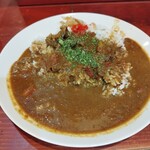 这家餐厅位于天满桥车站附近的坡道上,靠近谷四一侧。我在工作日的午餐时间晚些时候,大约下午2点多到访了这家餐厅。这是一家备受欢迎的餐厅,曾被评选为食べログカレーWEST百名店之一,散发着大阪咖喱专门店的氛围。但与典型的大阪"香料咖喱"店有些不同,他们的菜单给人的印象更像是归类为"咖喱饭"的类型。 在这里,我点了看起来最像大阪香料咖喱的"日替わりヤドカリースペシャル"(含税1,100日元)。这个特别咖喱每天都会变换,据说有8种以上的蔬菜小菜,这种多样的配料确实让人想起了大阪香料咖喱。但当你仔细看每一道小菜时,比如煮紫菜、金平牛蒡、胡萝卜沙拉等,感觉有点像家常菜。从这个意义上说,它更像是一份奢华的咖喱饭,而不是大阪的香料咖喱。 小菜的分量非常大,因此米饭的分量也很多,确实很有食欲。虽然标称是中辣,但实际上相当辣,即使混合着吃,辣味也会逐渐增强。我点了一份迷你酸奶(+200日元),但它真的很小,所以也许应该点普通大小的。 由于已经很长时间没有吃这种丰盛的咖喱了,我有点担心能否吃完,而且椅子的舒适度也让我有点分散注意力,所以味道的印象有点淡。但除了特别咖喱外,其他咖喱的价格在800日元左右,对附近的商务人士来说可能是个不错的选择。