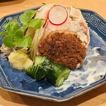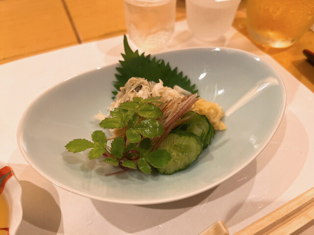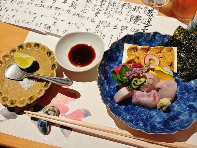我点了一份菜单,但因为菜单上太多我都很感兴趣,最终还是选择了套餐。套餐价格为16000日元,我特意点了淡路岛产的海胆,非常美味❤️ - 先付是提前准备好的,立刻端上来。味道很浓郁。 - 刺身拼盘让我兴奋不已,点了海胆真是明智的选择❤️,谢谢❤️ - 汤是用苔菜而不是海藻做的,竹笋和苔菜是绝佳搭档。 - 母蟹剥得干净,真是幸福,我想搭配日本酒。 - 天妇罗里还有鲀鱼白子,但对我来说稍微有点干,我喜欢更脆的口感。 - 凉拌菜是山笠红叶,第一次尝试,口感很爽脆,苦味不多,非常好吃。如果哪里有卖的话,我一定会购买。 - 主菜有肉、金枪鱼、鲍鱼等,非常豪华!可以一点一点地品尝,非常幸福。 - 最后是豆饭,虽然简单但在陶罐里煮得很鲜美。 - 甜点是冷糯米糕,很有冲击力,完全包间,可以悠闲享受。最后上来的新米小哥不小心碰到茶碗的边缘,我在考虑是否应该提醒他。感谢美味的餐点。