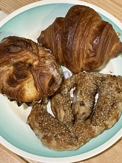 我在前往目标面包店的路上停了下来。店里有大约2位顾客,我立刻有了"当打之选"的直觉。个人认为这家West面包店非常好!有很多种硬皮面包,而且价格合理。只接受现金支付。购物袋是要付费的,但他们会用较大的塑料袋包装,这种考虑非常棒。 - 橙味海盐法棍 180日元 海盐面团中添加了橙皮,清新怡人。经过重新加热后,表面香脆,内部松软。 - 橄榄小球 190日元 三个圆球状的面团中包含了整颗绿橄榄x3。在东京,一个这样的圆球的价格就能买到。 - 发酵黄油牛角面包 190日元 表面酥脆,做得非常好,黄油的香味也很浓郁。 - 番茄乡村面包 260日元 加入了美味的干番茄。我对这种价格只能说惊讶不已。质量也非常不错。不是因为价格实惠,而是太便宜了。丹麦面包看起来也很美味,但我担心携带不方便,所以下次再尝试。虽然我不经常来这个地区,但每次来都一定要去的面包店。希望附近也有这样的店,如果有的话,我可能每周都会去一次。