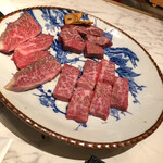 今晚我在这家餐厅享用了但馬牛烤肉,点了特选鹿腱肉、特上腰肉、特上牛腩肉、克里斯汀牛排、上等腰肉、内脏拼盘、烤蔬菜拼盘、拌饭、泡菜和生啤酒。内脏拼盘有各种不同的部位,虽然看起来有点奇怪,但味道很好。考虑到这个价格,性价比很高!用餐愉快!后来才知道这家餐厅被列为百名店,我完全同意!
