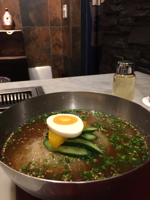2020年12月26日(星期六)我点了特上牛腹肉2600日元(不含税)和泡菜壶菜1800日元(不含税)。这里还有猪肉、牛五花肉、猪内脏、大蒜、蔬菜等食物。一旦尝过,就会爱上自家制的冷面,价格为1200日元(不含税)。这里的手工面条是从面粉开始制作的,口感浓郁而有弹性。冷面的汤也是手工制作的,经过5小时以上的烹饪,是一道特别的佳肴。还有玉米茶和自制蔬菜汁可供选择。强烈推荐自家制的冷面。