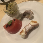 我之前一直想去,但总是不愿意去附近的意大利餐厅“Il Pistaqqio da Saro”。终于去了。首先点了啤酒,是Messina。矿泉水包含在套餐价格中。换句话说,额外的水可能是收费的。他们给了我们1.5升的瓶装水,尽管我们只有两个人。首先上来的是面包,非常美味。开胃菜有今日的七道前菜,包括Panelle(炸鹰嘴豆粉饼),非常适合搭配啤酒。然后我们点了红葡萄酒Grifinele Oreio。这里的酒都是西西里的,让人感到他们的用心。接下来是Gelatina di maiale(猪肉冻),猪肉有非常好的嚼劲和味道。接着是Petto di pollo arrostito(烤鸡胸肉),非常嫩,不像鸡胸肉,薄荷味道很独特,非常适合搭配酒。接下来是Frittata con le fave(蚕豆煎饼),就像意大利的煎蛋饼,蚕豆的风味很浓郁,即使不喜欢蚕豆的人也可以吃。然后是Salsiccia condita(味道浓郁的香肠),味道很丰富,但不会感到沉重。接下来是'Mpanata di agnello(羊肉派),用面团包裹各种配料,然后烤制而成,羊肉非常美味。最后是Involtini di maiale al pistacchio(开心果味的猪肉卷),但感觉开心果的味道不是很明显,猪肉有点干。第二杯红酒是La Segreta Rosso。主菜是Farsumagru(小牛肉饼),内部有整个鸡蛋,有点像英国的Scottish Egg。配菜有Piselli alla menta(薄荷味的豆子)。甜点是Arancia rossa(红橙子),然后是Cannolo(卷饼)或者Sfincioni di San Giuseppe(圣约瑟夫面包)或者Gelato al pistacchio(开心果冰淇淋)或者Vinodolce(甜酒)。饭后饮品有咖啡或者桃子茶或者消化酒或者柠檬汽水。总共每人6000日元(含税、座位费、500毫升矿泉水),包括饮料在内一共23660日元。真的很美味。因为店主独自经营,只有8个座位,所以周末很难订位,但值得专程来茨木。我住在附近,所以下次还想再来。既然是西西里菜,下次一定要尝试夏季的海鲜。