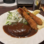 已订购的菜单☆数量有限的国产牛汉堡肉(红酒汁)和炸虾(2尾)(塔塔尔酱)汤(新土豆和白葱汤)附沙拉饭。用餐愉快!感谢Grill Baranoki!