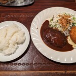 我在大阪中央区东心斋桥一丁目的心斋桥筋旁边参观了百名店格里尔ばらの木先生。我前来品尝午餐。午餐菜单包括汉堡和鲷鱼奶油可乐饼,附带汤、米饭和沙拉,价格为2,400日元。首先上来的是冷汤,非常美味。汉堡、鲷鱼可乐饼和沙拉一起摆在盘子里,看起来像是一家美味的西餐厅。汉堡上淋着的红酱汁非常美味!它增强了汉堡的味道。鲷鱼可乐饼也有着浓郁的奶油味。两者都使米饭更好吃。我很快就吃完了,这是一家极力推荐的餐厅,我想再次光顾。