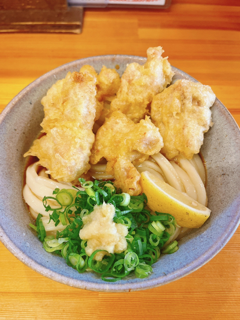 初次尝试乌冬面,我们去了一家乌冬面店!平日开门不久后,大约10分钟左右,已经有了不少顾客(´ര ̫ ര`) 我和另一位朋友来分享,总是难以决定是要生酱油汤面还是乌冬拌面,但今天我们选择了乌冬拌面!我的固定选择是咖喱★鸡蛋天咖喱★鸡天乌冬拌★配菜饭(午餐时只需100日元)★鱿鱼天首先是鸡天乌冬拌,可以选择细面,所以我选了冷的细面。我也喜欢细面的拉面,所以很期待。乌冬面在乌冬面中算是相当细的(´⊙ω⊙`) 光滑且细,但有弹性,非常Q弹。“哇,好好吃♡♡”因为没有其他顾客,我有点害怕,但真的很好吃!!(*ᴗ͈ˬᴗ͈)⁾⁾⁾☆鸡蛋天咖喱乌冬面的面条比常见的中等宽度面条稍粗一点,热辣辣的咖喱中也有弹性!鱿鱼稍微厚一点,味道也浓郁,半熟鸡蛋也美味(*ˊᵕˋ*)ノ" 咖喱味道不辣,甚至可以说有点甜?我觉得有浓郁的高汤味。薄炸豆腐也很好吃,我喜欢辛辣浓稠的咖喱,所以这是个口味问题( ´~` )☆配菜饭在午餐时只需100日元!而且分量非常大,配料也相当丰富,味道不过于浓重,米饭也不过于松软,非常合我的口味☆我本来以为鱿鱼天是作为配料的,结果却放在盘子里,甚至还附带盐⸜(*ˊᵕˋ*)⸝ 味道普通。因为今天没有抱太高的期望,所以感觉格外美味,这次乌冬面午餐非常令人满足(⑉> ᴗ <⑉) 非常感谢!!