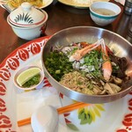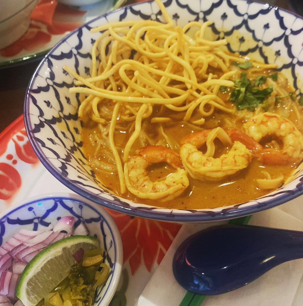 坎索伊昆(虾)虾是第一次尝试。椰子的甜味和虾头熬制的高汤中充满香料。汤像饮料一样美味。面条又脆又有嚼劲。中途可以挤一些洋葱和青柠汁来调味。这碗面条令人陶醉。吃了它会让人心情愉快的食物。