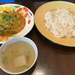 椰奶和香茅的味道非常令人印象深刻的汤。面条看起来很粗,像手工制作的。这次我点了鸡肉(Gai)。炖得很软的鸡肉上面有两块。椰奶的甜味,当然还有辛辣。不过,我认为这是可以美味地吃的辛辣。当然也有香菜。这次鸡肉饭卖完了,所以下次我想再试一次。