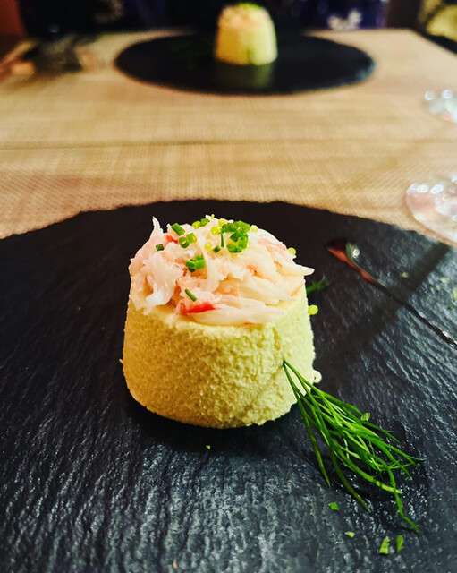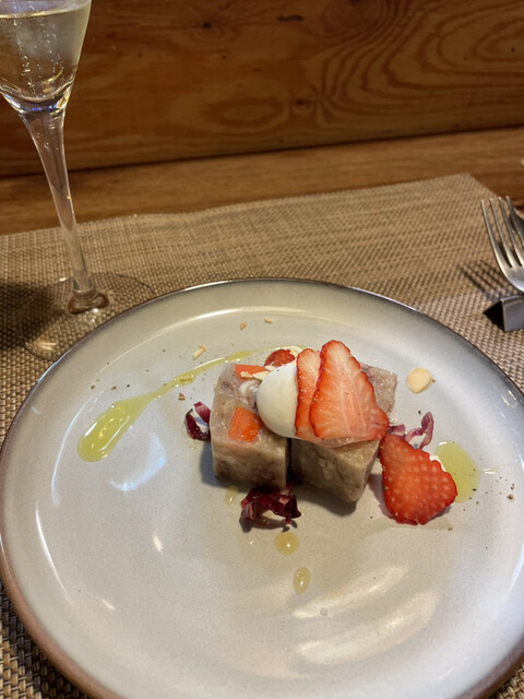 这家餐厅我早就想去了,但不知何时起(据说从六年前开始),只接受两人以上的预订。午餐只有套餐可选。在预订时选择肉或鱼。两人必须选择相同的菜品。这次和朋友一起去喝了点酒,所以忘记拍很多照片,内容有些不完整。我们每人花了8000日元以上,因为套餐价格是3990日元,而其中一个面条选择要加250日元,另外我们点了一瓶价格较便宜的起泡酒和一瓶夏多內白葡萄酒(因为忘记拍酒单照片,所以不知道品牌),酒费大约是9000日元。 前菜有3道菜。不是3种不同的前菜。 第一道是豆蓉上面加了蟹肉。 第二道之前被问到“你讨厌西红柿吗?”我以为我们不喜欢,结果里面有奶酪和西红柿。 第三道是巴尼亚卡达,不清楚有哪些蔬菜,但都不会很硬,很好吃。 第一个面条是定死的,是热那亚面,所以理所当然是热那亚酱的面。 第二个面条可以从菜单上选择,但因为忘记拍菜单,所以不知道是什么种类和内容,只知道有松茸,虽然没有闻到松茸的香味,但非常好吃! 主菜是鲍鱼煎煮的番茄炖鱼。 现在回想起来,他们确实问过这道菜的番茄是否可以,但是一切都没问题。 面包也在最后上桌,最后是甜点,包括冰淇淋、糖果和水果。 在这时,服务员看到我们还有酒没有喝完,建议我们换成奶酪拼盘。 整顿餐时长两小时,但绝不是等待食物的时间间隔,而且味道美味,分量也很足,晚餐根本不需要吃了。 那天是星期六,但除了我们一组客人外,其他人都没有,这么好吃,客人这么少真是奇怪。即使更受欢迎也不奇怪。