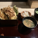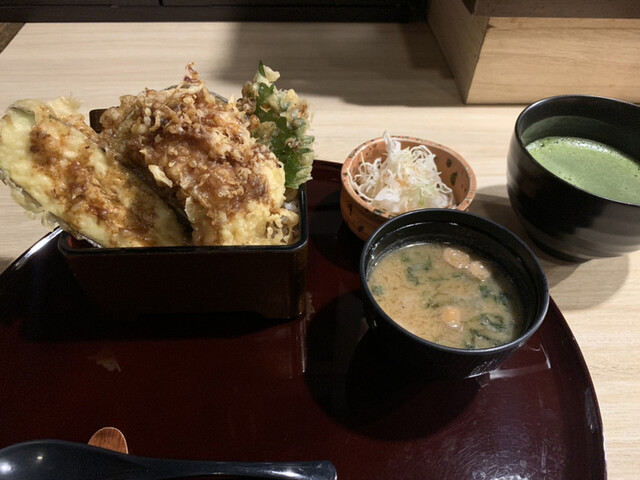 这次的综述。温和和柔和的白肉鱼的浓郁风味似乎升级了...就像上次品尝到的“被冷抹茶打动”的感觉一样,今天也是从那里开始的!在厨房深处,有人慢慢地调制抹茶吗?清凉而带着咖啡因的,绿茶养生。今天又点了一份丰盛的天婦羅。只要1200日元,“既然都来了,就来点传助穴子吧”,不禁这样想。所谓“既然来了就来点魔法”。但是,这家店的“既然来了就来点魔法”是有价值的,我认为。味噌汤里似乎加了红味噌,口感浓郁。螺旋油麸。好吃。脆脆的大叶子炸得香脆。从声音上来看,这是夏天!(这是一种语气。)甘薯。茄子也浸泡在油里,咕噜咕噜地炸得酥脆,证明了茄子和油的搭配确实非常好。然后,就像国王一样,是传助穴子。非常柔软。肉质松软而湿润。这么淡雅的白肉鱼竟然如此多汁湿润,还有其他的吗!?好吃得仿佛在大声宣扬一样。酱汁涂得很多,但是不知为何没有感觉到浓郁或过甜。不甜腻,也不辣。有酱汁但不粘在米饭上。吃得一干二净!(理所当然。)\(•ㅂ•)/碰巧来的时间还算宽裕,还免费续了一杯冷抹茶。感觉很划算~下午也要加油了。或者说,每次都可以来这里,感觉可以从中午开始努力工作。这是丼饭的定位。