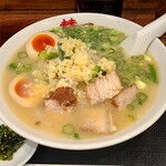 拉面赞平。位于鹤桥站前的蒜味拉面。我在晚上10点半左右到达,虽然座位满了,但因为客流转得很快,所以很快就进了店里。这碗拉面总体来说有点像萨摩拉面,但相比之下可能味道稍微浓一些。据说他们使用了青森产的大蒜,但因为是生的,所以气味非常浓烈,甚至第二天早上还能闻到。加了蒜薹(免费),所以更美味了,但可能不太适合在工作前吃。我觉得会有蒜味的消除,但没有蒜味会感到有点寂寞。叉烧面 1100日元。
